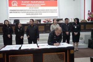 Senin, 24 November 2025 — Pemerintah Kabupaten Minahasa kembali menunjukkan komitmennya dalam memastikan proses perencanaan pembangunan dan penganggaran berjalan tepat waktu dan sesuai regulasi. Hal ini ditandai dengan kehadiran Bupati Minahasa, Bapak Robby Dondokambey, S.Si, MAP, bersama Wakil Bupati Minahasa, Ibu Vanda Sarundajang, SS, pada Rapat Paripurna DPRD Kabupaten Minahasa dalam rangka Penandatanganan Nota Kesepakatan Kebijakan Umum Anggaran (KUA) serta Prioritas dan Plafon Anggaran Sementara (PPAS) Tahun Anggaran 2026.